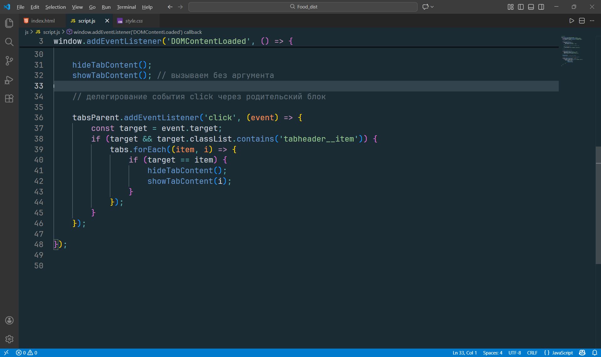 Вызываем обе эти функции, в вызов функции показывания таба передаём 0, чтобы показать первый таб.