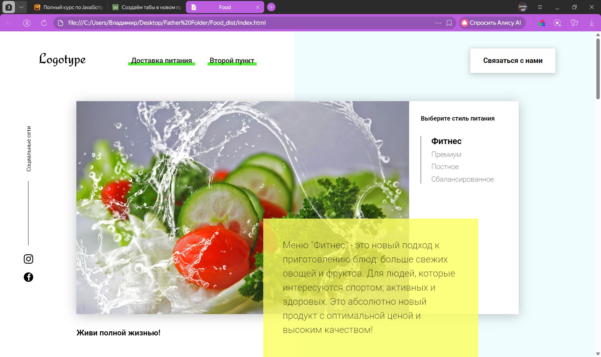 "Выберите стиль питания" Для начала нам понадобится получить классы тех элементов вёрстки, с которыми мы будем взаимодействовать: пункты меню, на которые мы будем кликать, блоки с описанием меню (с классом